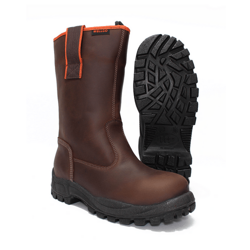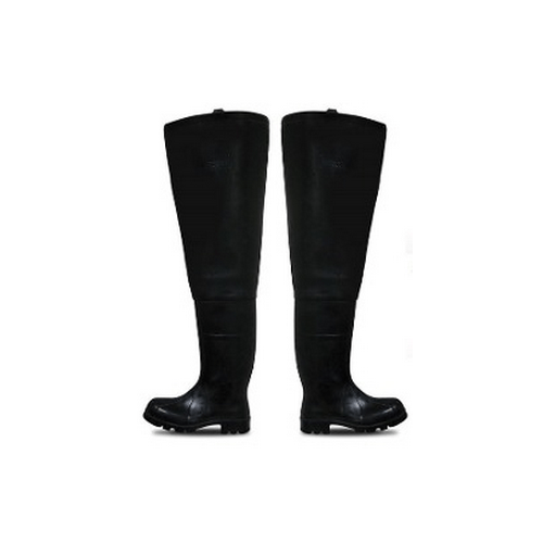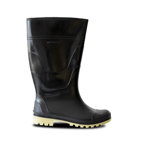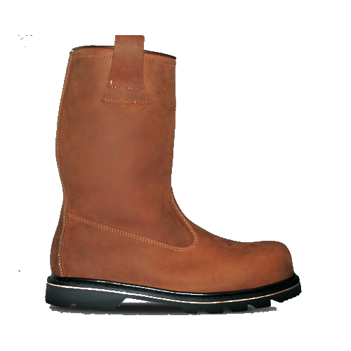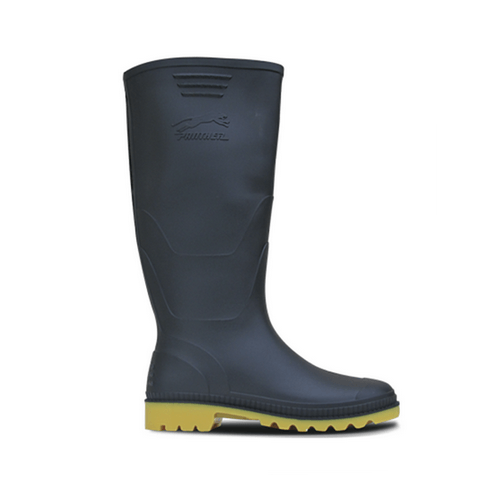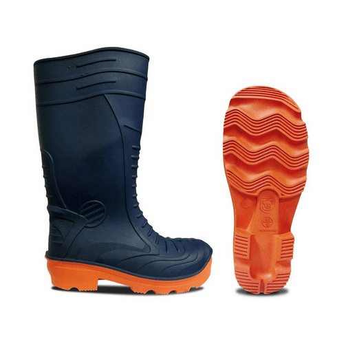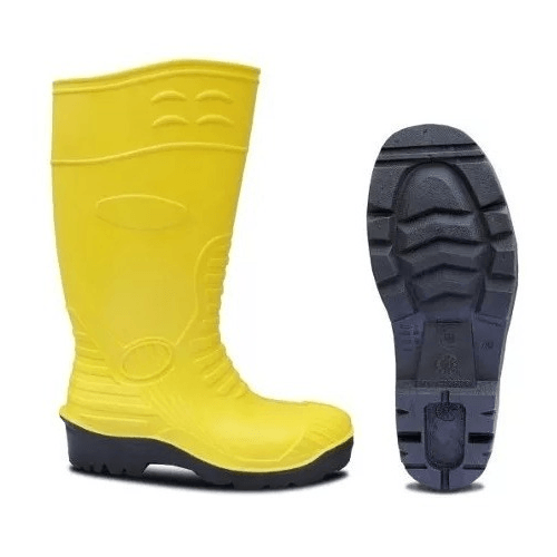Bota impermeable con punta de acero y conribete en la parte superior.