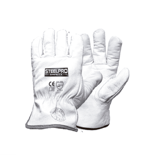 Guante todo de piel con encuarte entre palma y dorso, refuerzo tipo tira entre el dedo medio y anular para mayor durabilidad, el dedo pulgar esta costurado con dos costuras y en una sola pieza para mayor acoplamiento al mismo, con ajuste de elástico o cintillo para una excelente maniobrabilidad.